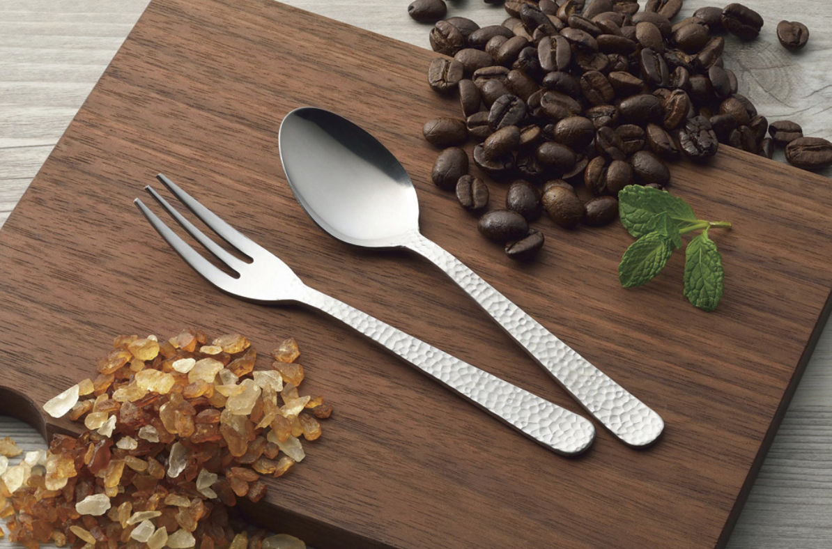 產自日本著名的「金屬加工之都」——新潟縣燕市。這套茶匙叉組合不僅是一件餐具,更是職人工藝的結晶。表面細膩的「錘紋」處理,是透過匠人精準的敲擊力道,交織出如水面波紋般的凹凸質感。這種工藝不僅讓金屬散發出溫潤的光影變化,錘紋設計更巧妙地避免了鏡面餐具易留指紋的困擾, 握在手中更能感受到與眾不同的厚實與防滑感。小巧玲瓏的尺寸,最適合搭配蛋糕、和菓子或手沖咖啡使用。